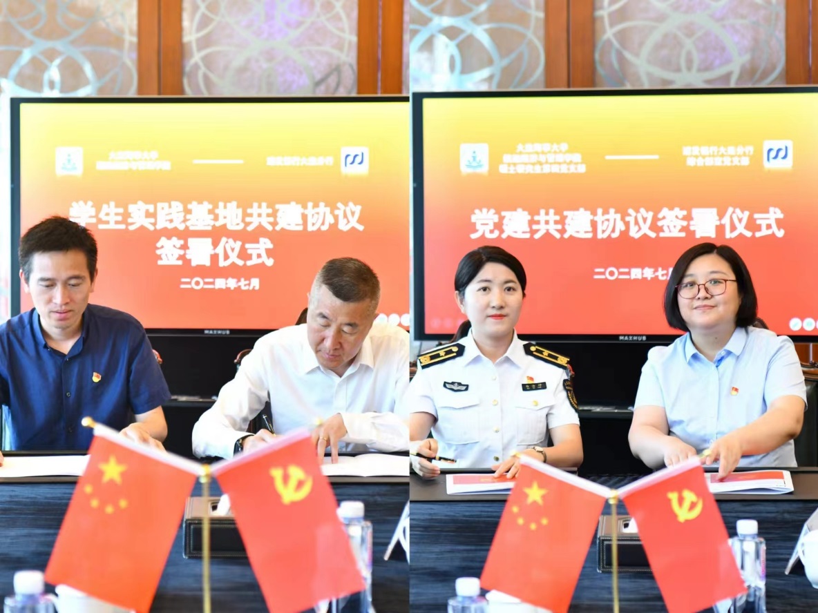 硕士研究生第四党支部书记白汝坤与浦发银行大连分行综合部室党支部书记赵薇签订《党建共建协议》。