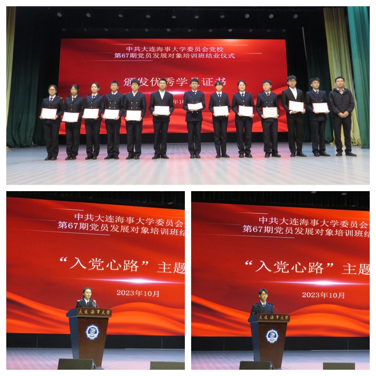 党委副书记、副院长、纪委书记王振兴为优秀学员代表颁发了证书并作结业致辞,轮机工程学院任梓萌等7名学员代表结合学习情况与自身实际作了“入党心路”的主题演讲。